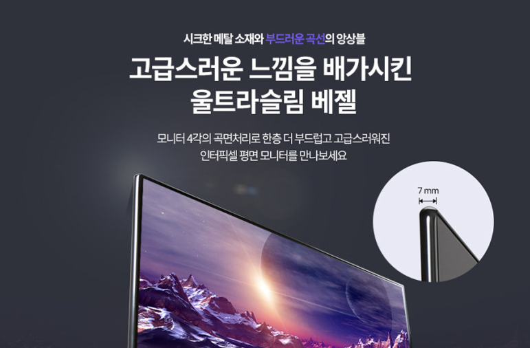 사각지대가없는 광시야각 VA패널과 모니터 4각의 곡면처리로 부드럽고 시크한 메탈소재와 7MMD의 울트라 슬림 베젤로고급스러워진 평면 모니터라고합니다.