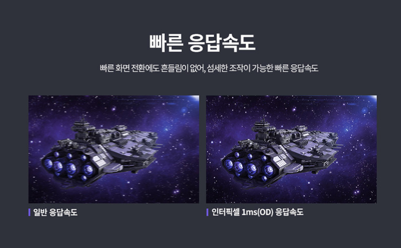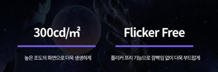 초고속 주사율에 걸맞는 매우 빠른 응답속도를 지원하며 빠른화면전환에도 흔들림이나 잔상 없는 선명한 화면을 보실 수 있다고 되어있습니다.높은 조도의 화면으로 더욱생생하게 화면을 감상할 수있으며 사용자의 눈 건강을 위하여 화면의 깜빡임을 없애 장시간 사용에도 눈의 피로도를 줄여주는 플리커프리 기능을 탑재했다하네요.