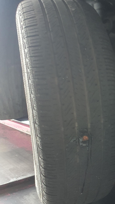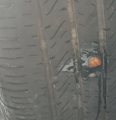 바퀴에 못 같은게 박혀있는 걸 발견했어요.