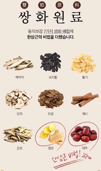 쌍화원료는 동의보감 7가지 쌍화 배합에 한삼근의 비법을 더했다고 합니다.