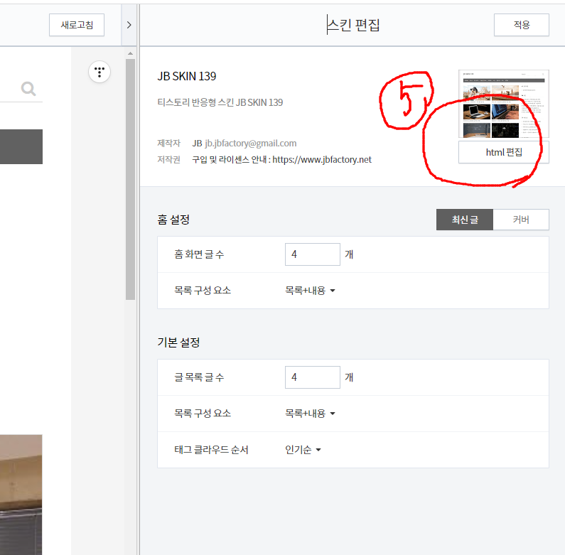 5. 스킨편집에서 오른쪽 html 편집으로 들어간다.
