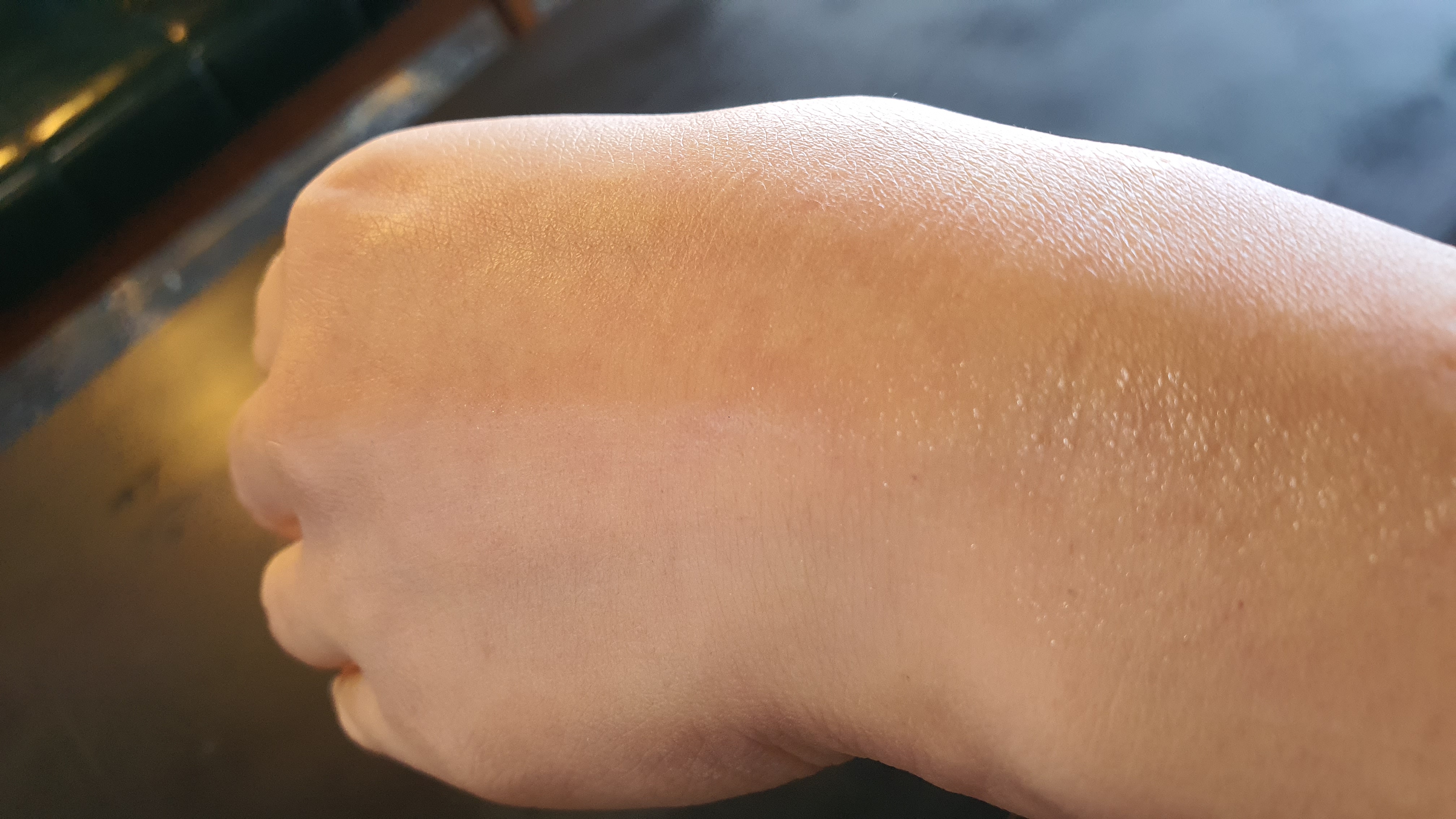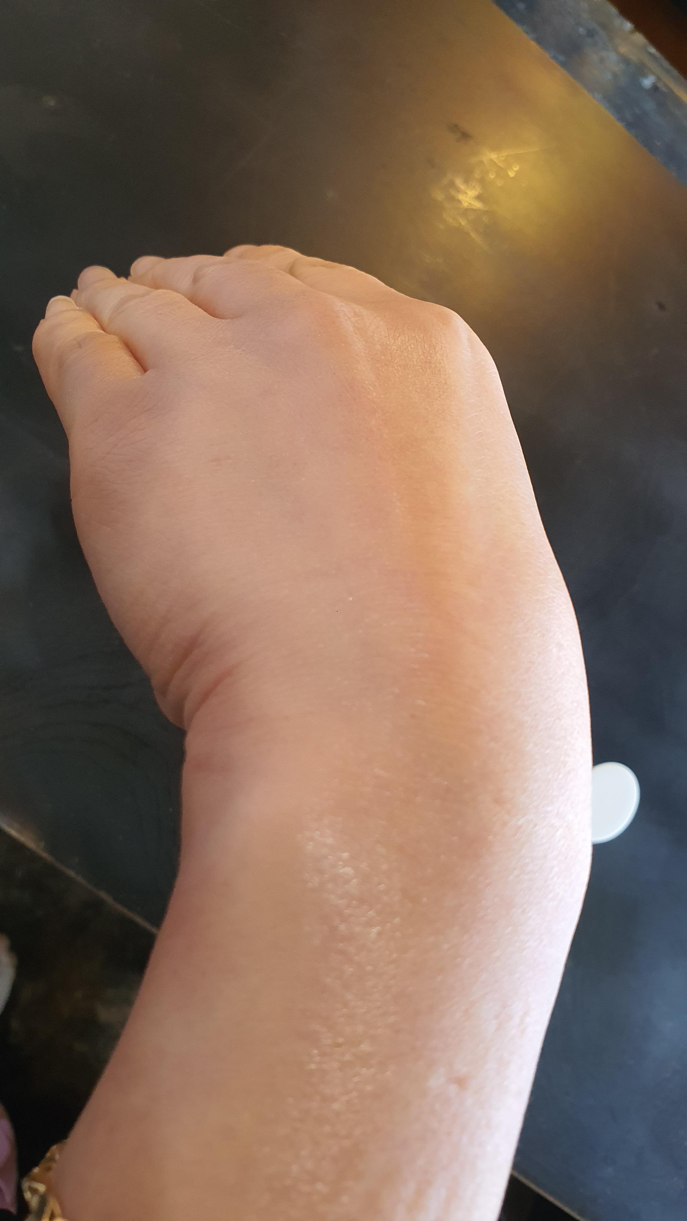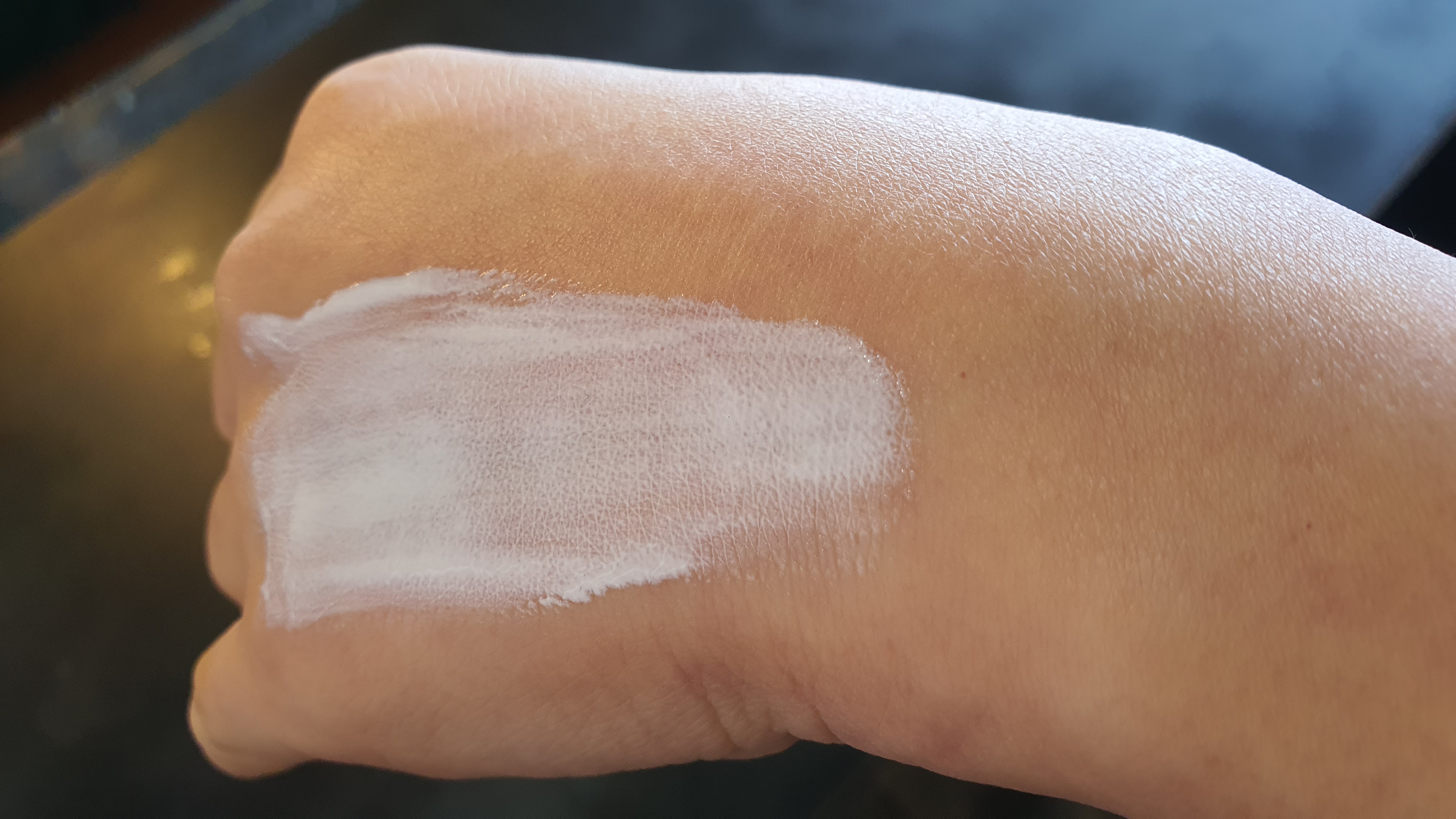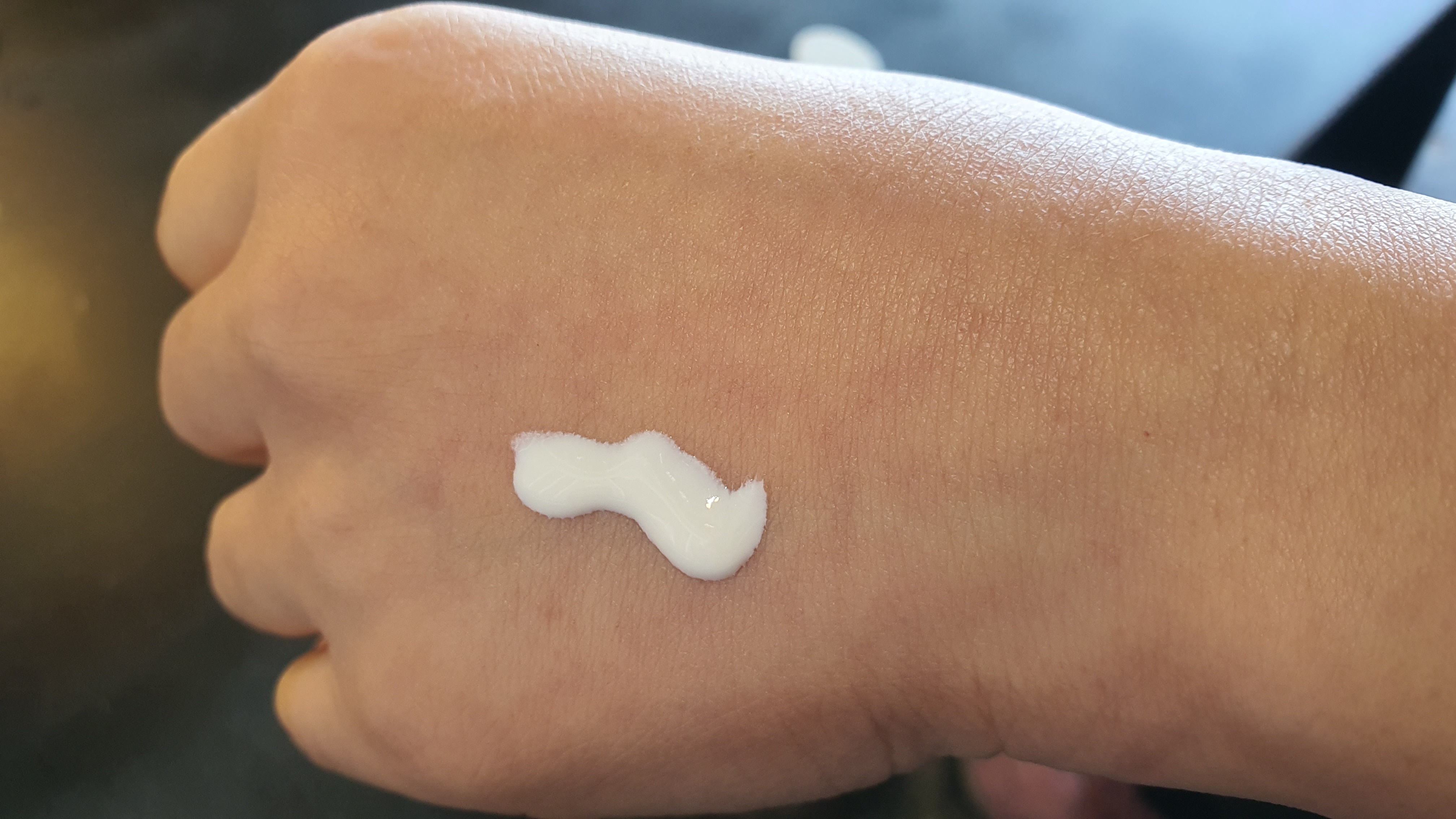 베네핏 포 어스 선크림을 왼손 손등 위에 왼쪽 반만 발라보았습니다.
