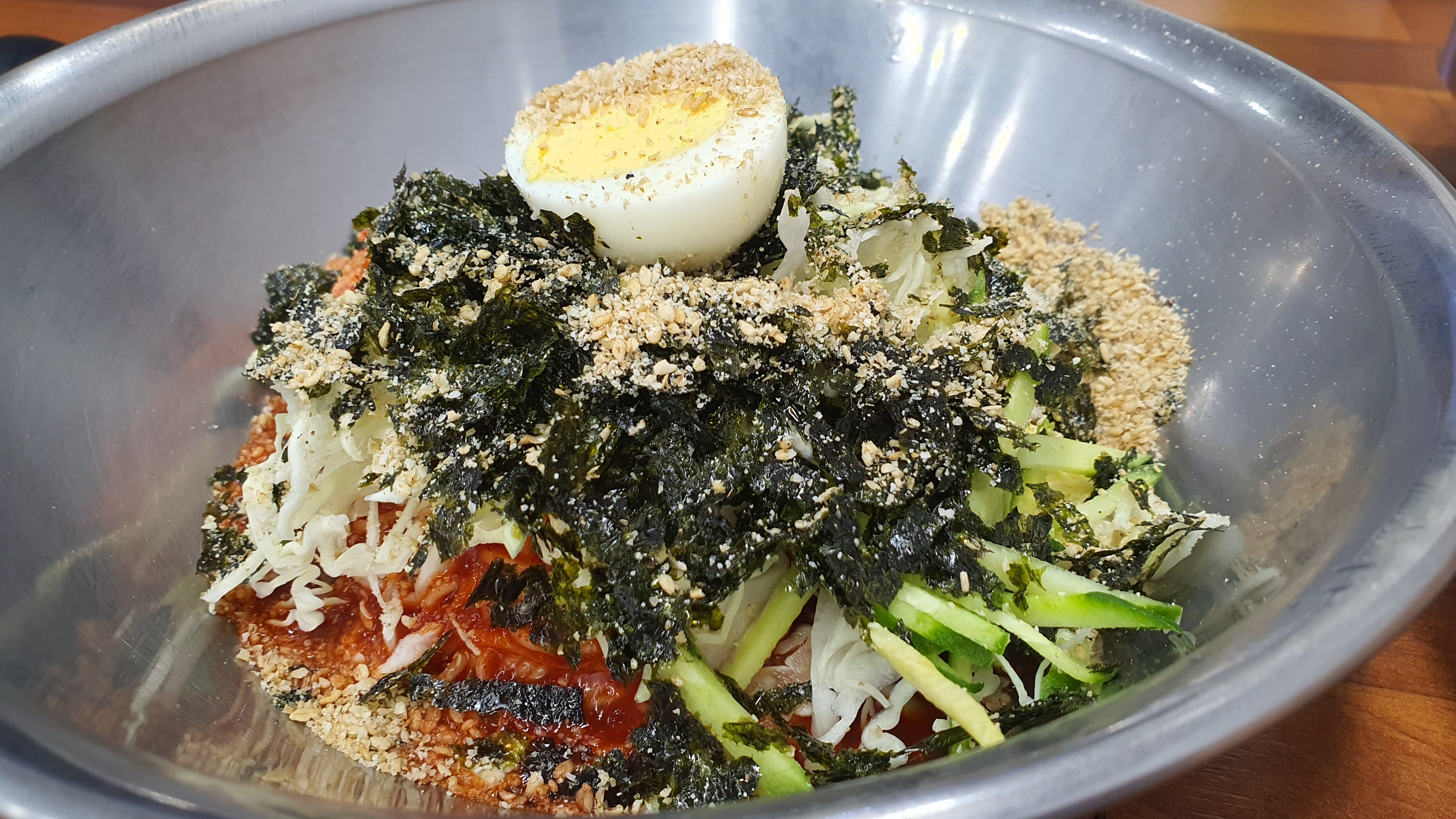 그리고 두 번째 메뉴인 비빔국수는 고추장색부터 집에서 엄마가 양푼에 비벼주던